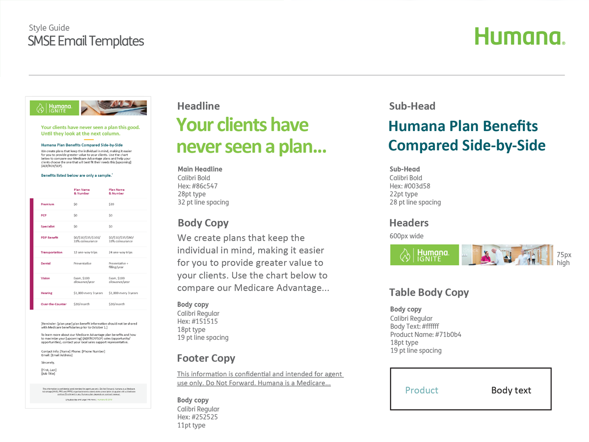 At Humana, I contributed to the development of a digital email style guide designed to help internal teams create brand-aligned communications quickly and consistently. The guide defined core UI components, typography, layout standards, and visual guidelines that supported scalable email production across marketing and member communications.