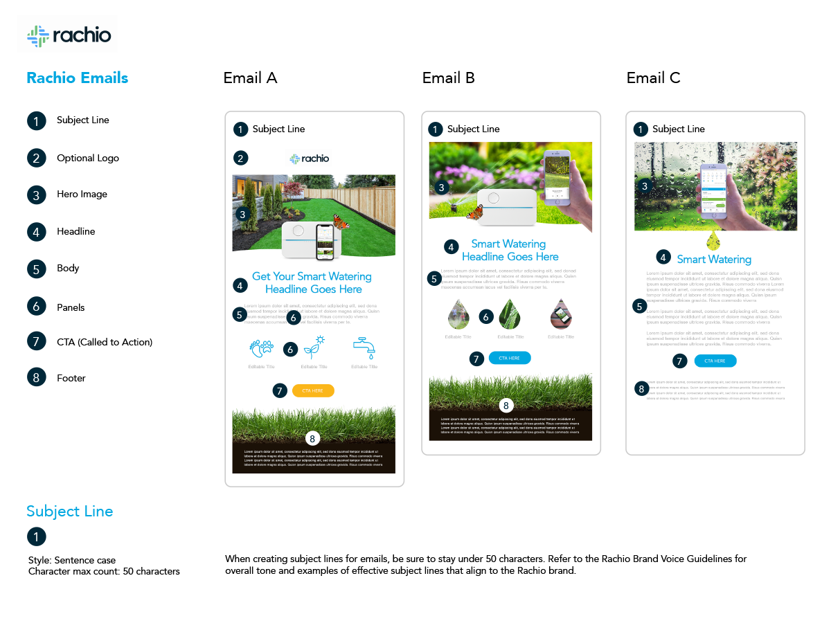 At Rachio, a startup developing smart sprinkler systems and water-management technology, I designed and built a scalable email template system to support marketing campaigns and customer communications. The goal was to create a flexible framework that allowed the team to produce visually consistent, brand-aligned emails quickly and efficiently.