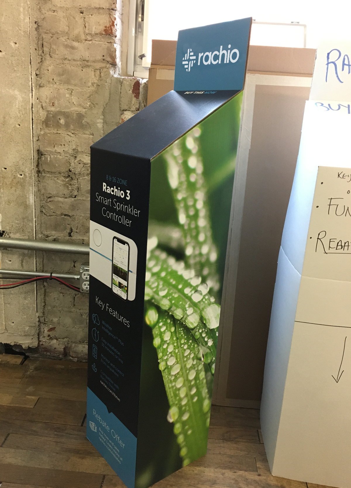 At Rachio, a startup developing smart sprinkler systems and water-management technology, I designed a point of sale display to support the launch of a new product within Home Depot stores across the United States. The goal was to create a visually engaging in-store presence that would capture attention, communicate key benefits quickly, and drive purchase decisions in a retail environment.